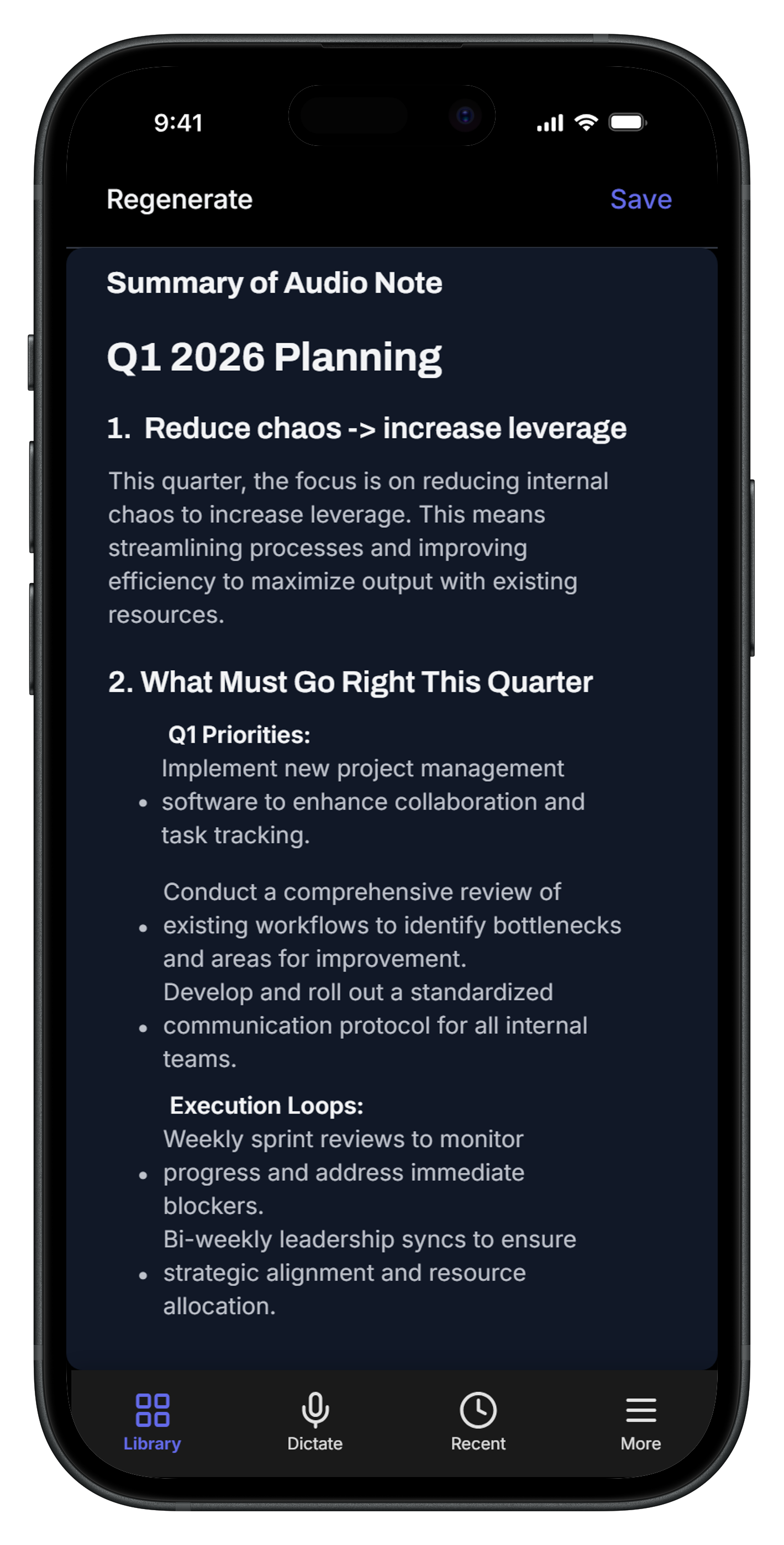 From noise to signal in secondsRaw data is useless without structure. Our AI instantly analyzes your captures to generate high-signal summaries, identify key action items, and categorize content. It doesn't just transcribe; it understands the context and intent behind every word.